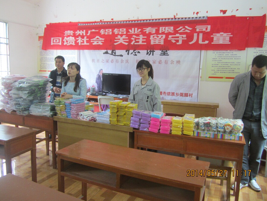 上午9:30時(shí),滿載慰問品的車隊(duì)從公司出發(fā),并用半小時(shí)左右的時(shí)間到達(dá)目的地——隴腳村。隴腳村位于貴陽市東北部烏當(dāng)區(qū)新堡布依族鄉(xiāng)境內(nèi),地處山區(qū),經(jīng)濟(jì)落后,交通閉塞。在當(dāng)?shù)卮逦瘯姆e極配合下,慰問活動進(jìn)展井然有序。到達(dá)目的地后,我們首先向各位村民簡要介紹了貴州廣鋁鋁業(yè)有限公司以及此行的目的,隨后為留守兒童逐一派發(fā)了書包、文具等學(xué)習(xí)用品。看到小朋友們臉上天真無邪的笑容,我們的心中充滿了喜悅和感動。