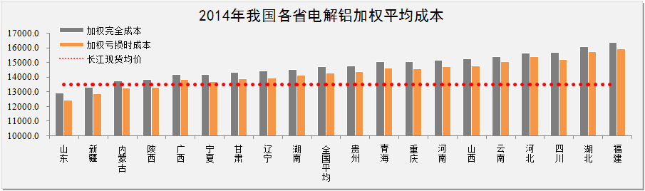 各省加權完全成本。2014年全國僅山東和新疆地區電解鋁能夠實現理論盈利,兩地區加權完全成本分別為12909元/噸和13334元/噸。其余18個主要電解鋁生產省份加權完全成本均高于長江現貨價格,處于理論虧損狀態。山東地區電解鋁實現理論盈利的主要原因是該地區的電解鋁生產企業在其他成本控制方面優勢明顯;新疆地區主要在電力成本方面具有相對明顯的優勢,隨著各電解鋁生產企業逐步上線自備電廠,預計新疆地區電力成本優勢將有所稀釋。