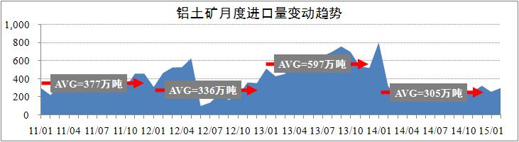 自2014年2月以來,我國鋁土礦進口量增長一直保持在較低水平。監(jiān)控數(shù)據(jù)顯示,2015年1-2月份進口量分別為260萬噸和300萬噸,預(yù)計進口量水平基本與2014年保持一致,全年月度平均進口305萬噸。當(dāng)期,山東宏橋、中鋁國貿(mào)和信發(fā)鋁業(yè)成為主要進口企業(yè),進口量合計占比85%;澳大利亞、印度和馬來西亞則是主要進口原產(chǎn)地,當(dāng)期合計占比高達91%。