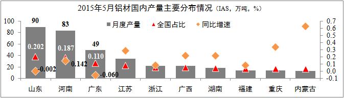 發(fā)稿時(shí)間:2015-07-17鋁材市場(chǎng)保持較快增長(zhǎng)。監(jiān)控?cái)?shù)據(jù)顯示,自3月以來(lái),我國(guó)鋁材月度產(chǎn)量均保持兩位數(shù)的增長(zhǎng)速度,其中5月份全國(guó)鋁材產(chǎn)量444萬(wàn)噸,累計(jì)同比增長(zhǎng)10.7%,增幅環(huán)比回落1.6個(gè)百分點(diǎn)。從區(qū)域分布上看,山東、河南以及廣東仍然保持鋁材產(chǎn)量前三的位置,其中廣東5月份鋁材產(chǎn)量49萬(wàn)噸,全國(guó)占比11%,但同比增速較上月回落了6%,降幅收窄0.3個(gè)百分點(diǎn)。