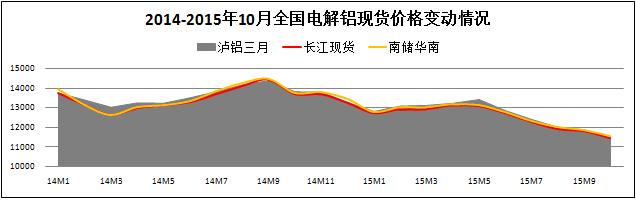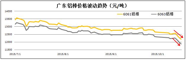 受全球鋁市疲態的影響,報告期內我國鋁棒價格呈現出階段性大跌的異常現象。截至10月中旬,廣東6063型鋁棒價格下浮至10995元/噸,月化環比下降11.1%。鋁棒價格大幅下浮的另外一個主要原因是鋁型材市場需求在原本疲憊的環境下,原料需求進入季節性淡季。