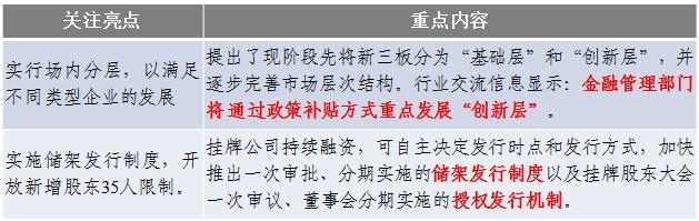 新三板市場再迎里程碑。中國證監(jiān)會于11月20日發(fā)布了《關于進一步推進全國中小企業(yè)股份轉讓系統(tǒng)發(fā)展的若干意見》,進一步明確了新三板的獨立市場地位和立足于服務創(chuàng)新型、創(chuàng)業(yè)型和成長型中小微企業(yè)的市場定位,同時為企業(yè)在證券市場的轉板預留了空間。此外,《意見》“現階段暫不實行連續(xù)競價交易”的規(guī)定在一定程度上限制了企業(yè)的板內融資便利性。