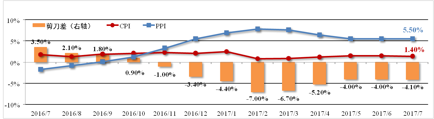 7月份全國(guó)居民消費(fèi)價(jià)格指數(shù)(CPI)為1.4%,較上月縮小0.1個(gè)百分點(diǎn),主 要原因在于水果大量上市致使鮮果價(jià)格下降以及豬肉價(jià)格疲軟。生產(chǎn)價(jià)格指數(shù)(PPI)為5.5%,連續(xù)三個(gè)月持平。剪刀差較上月擴(kuò)大0.1個(gè)百分點(diǎn)至-4.1%。