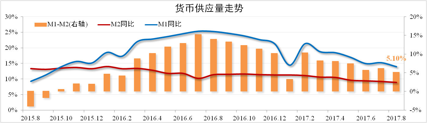 8月份M2增速為8.9%,較上月下滑0.3個百分點,M1與M2差額為5.1%,較上月縮小1個百分點。社會融資規(guī)模169.41萬億,同比上漲13.07%,其中實體經(jīng)濟融資規(guī)模115.46萬億,同比上漲13.77%,較上月提升0.09個百分點。