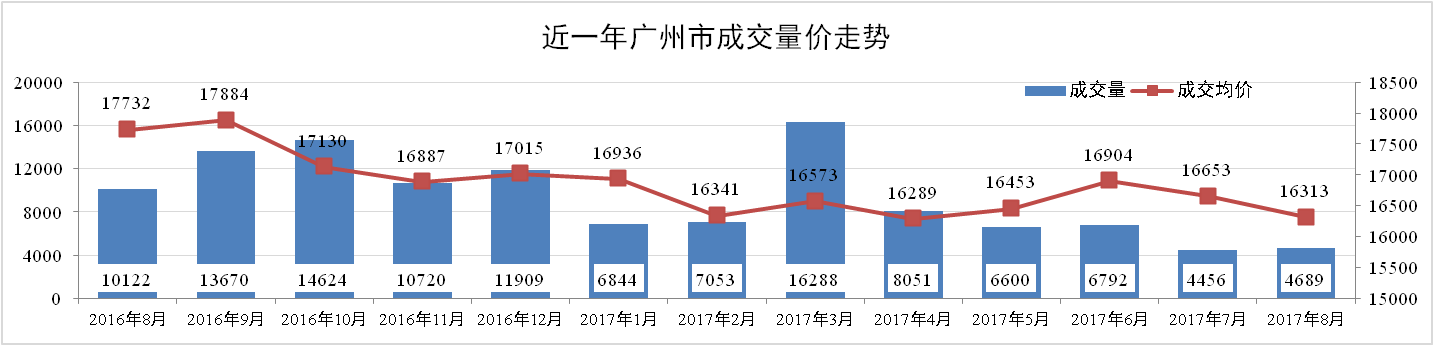 2017年8月,廣州一手住宅網(wǎng)簽呈現(xiàn)量增價跌現(xiàn)象。其中,一手網(wǎng)簽成交4689套,同比下降53.68%,環(huán)比上升5.23%;一手住宅網(wǎng)簽均價為16313元/平方米,同比下降8%,環(huán)比下跌2 %。