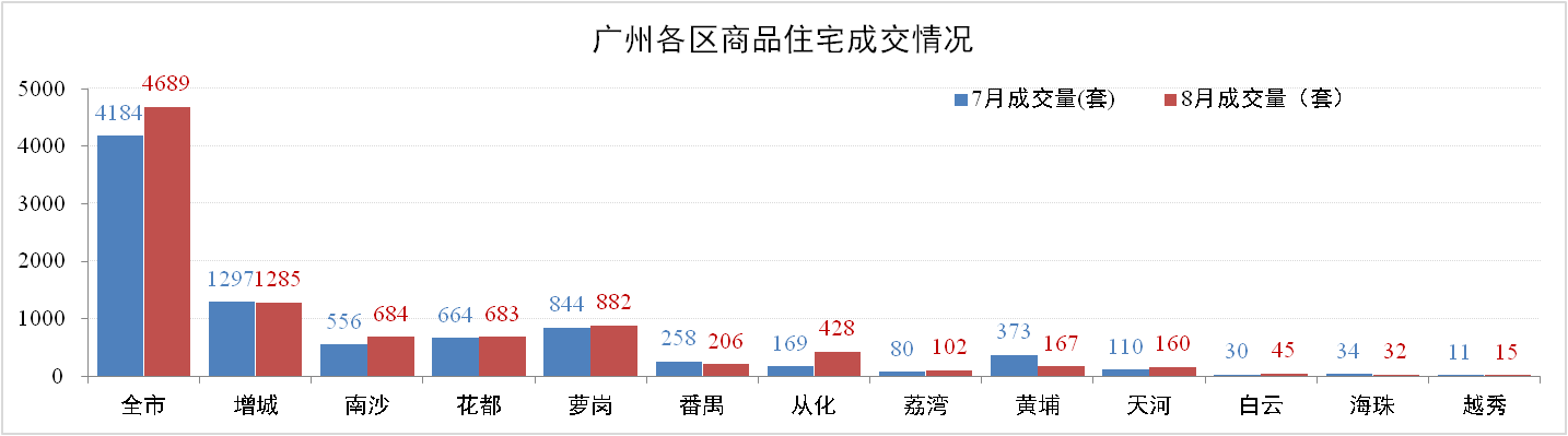 成交量方面:8月廣州市住宅成交有所回暖,但仍維持在歷史低位水平,成交主要在增城、花都、南沙和蘿崗四區(qū)。其中,增城區(qū)一手商品住宅網(wǎng)簽1,285套,環(huán)比下降0.93%。