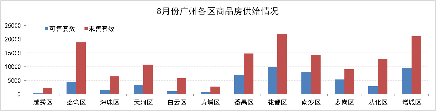 8月31日,廣州市新建住宅商品房共194,949套,環(huán)比上升3.1%,其中:可售住宅商品房為54,104套,占比27.75%;未售住宅商品房140,845套,占比72.25%。花都、增城、番禺、南沙庫存量較高,可售和未售房源累計占全市比例分別為63.73%和51.13% 。