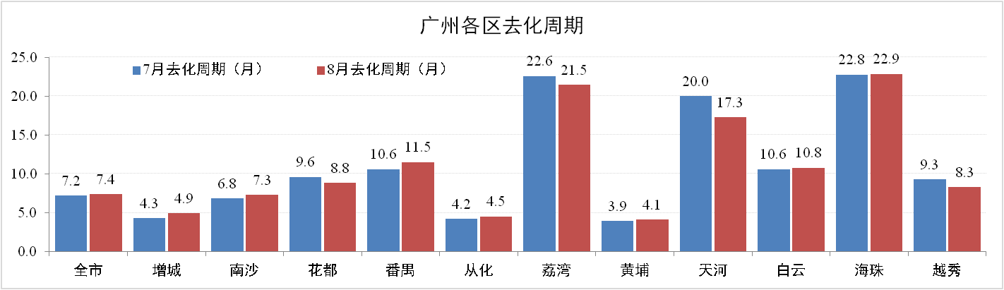 8月份廣州住宅地產(chǎn)去化率達86.6%,去化周期環(huán)比增加0.2個月為7.4個月。其中,增城、南海、番禺三區(qū)去化周期有所上升。但由于外圍地區(qū)剛需強勁,增城、從化、黃埔等保持低去化周期,增城去化周期僅為4.3個月。
