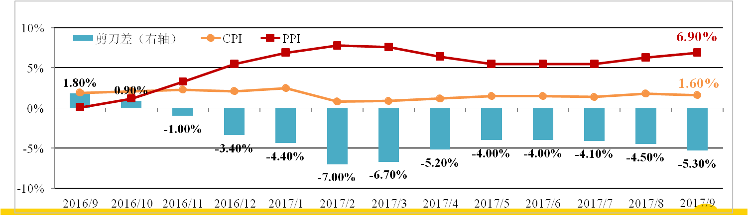 9月份我國CPI為1.6%,較上月縮小0.2個百分點,略低于市場預期,蔬菜 價格增速大幅放緩是主要原因,而核心CPI從2.2%升至2.3%,顯示價格正向下 游傳導。 受9月上半月黑色、有色大漲影響,PPI為6.9%,大超市場預期。