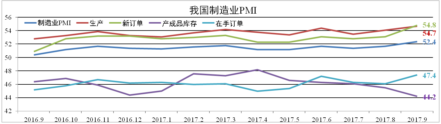 9月份我國官方制造業PMI為52.4,創下自2012年5月以來最高點。分項中, 在手訂單、新訂單分別擴大1.3、1.7個百分點至47.4以及54.8,產成品庫存縮小 1.3個百分點至44.2,生產上升0.6個百分點至54.7。