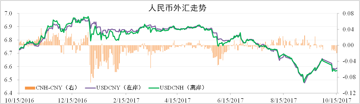 由于美聯儲縮表以及長假居民購匯需求增加等原因,人民幣貶值。但美 朝局勢動蕩,加之美國通脹疲軟,美元轉弱。截至10月15日,在岸人民幣匯 率為6.5884,環比貶值0.59%,離岸人民幣為6.5689,環比貶值0.37%。