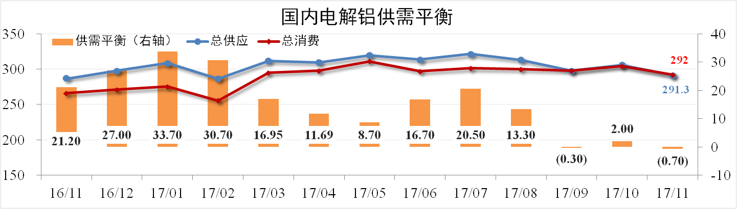 據(jù)阿拉丁數(shù)據(jù),11月份我國電解鋁產(chǎn)量291萬噸,同比上漲1.43%,環(huán)比下跌4.8%。凈進口0.3萬噸,總供應(yīng)量291.3萬噸,總消費量292萬噸,從靜態(tài)數(shù)據(jù)看,當月理論供應(yīng)短缺0.7萬噸。