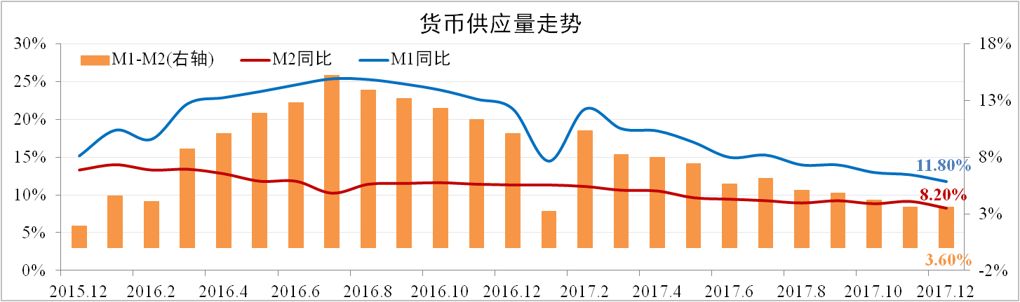 12月我國M2供應增速8.2%,M1增速11.8%,均較上月收縮0.9個百分點,剪刀差持平于3.6個百分點。社會融資規模174.64萬億,同比增長11.96%,增速較上月收縮0.74個百分點。