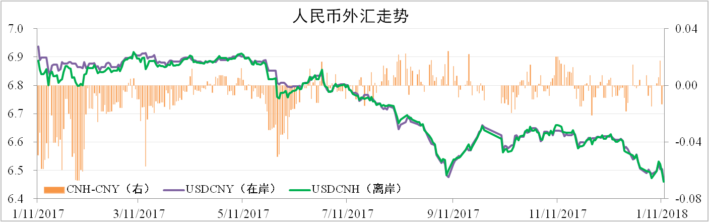 人民幣近期大幅上漲,截止2018年1月12日,在岸人民幣匯率為6.4606,環比升值2.43%,離岸人民幣匯率為6.4605,環比升值2.51%。1月9日央行通知部分中間價報價行對逆周期因子進行調整,調整后相當于無逆周期調節。