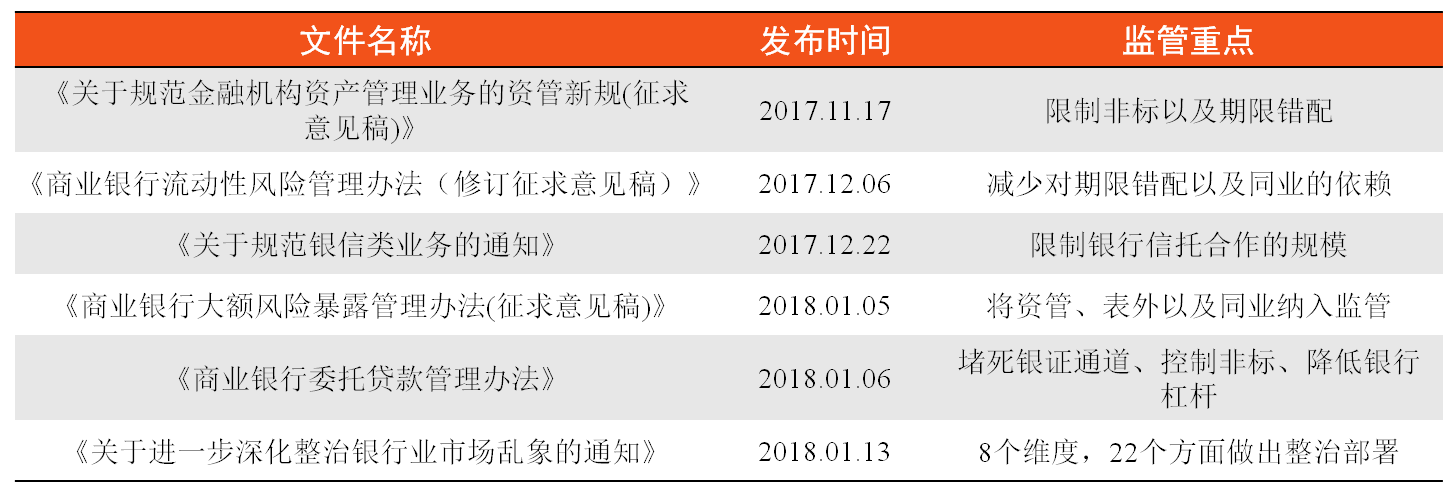 2017年11月17日至2018年1月13日,監管層連續發出多道監管政策,主要涉及銀行業。從所涉內容看,基本實現了全面無死角監管,非標準化資產以及通道業務基本被堵死。由于資金供給收縮,資金將通過標準化資產流向新興產業部門,房地產、過剩行業以及融資平臺利率將有所上升。