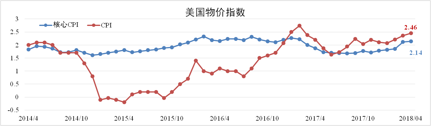 4月份美國CPI為2.46%,較上月擴大0.1個百分點,核心CPI為2.12%,較上月擴大0.02個百分點。通脹雖不及預期,但均高于3月。