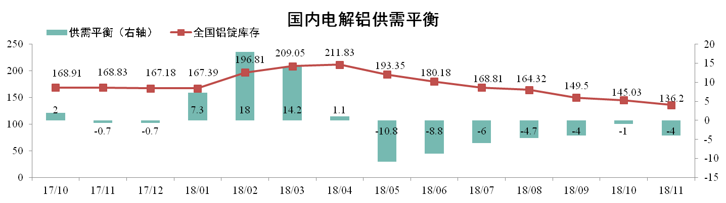 據阿拉丁數據,11月原鋁產量301萬噸,凈進口1萬噸,總供應量為302萬噸,消費量為306萬噸,當月理論供應短缺4萬噸。11月底全國鋁錠庫存136.2萬噸,環比下降6.09%。