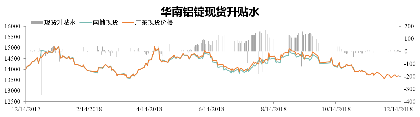 截至12月14日,南儲華南鋁錠現貨價報13680元/噸,環比上漲0.07%,廣東現貨成交價報13695元/噸,環比上漲0.11%。全國鋁錠庫存為136.2萬噸,環比下降6.09%。南海庫存為18.6萬噸,環比下降14.52%。