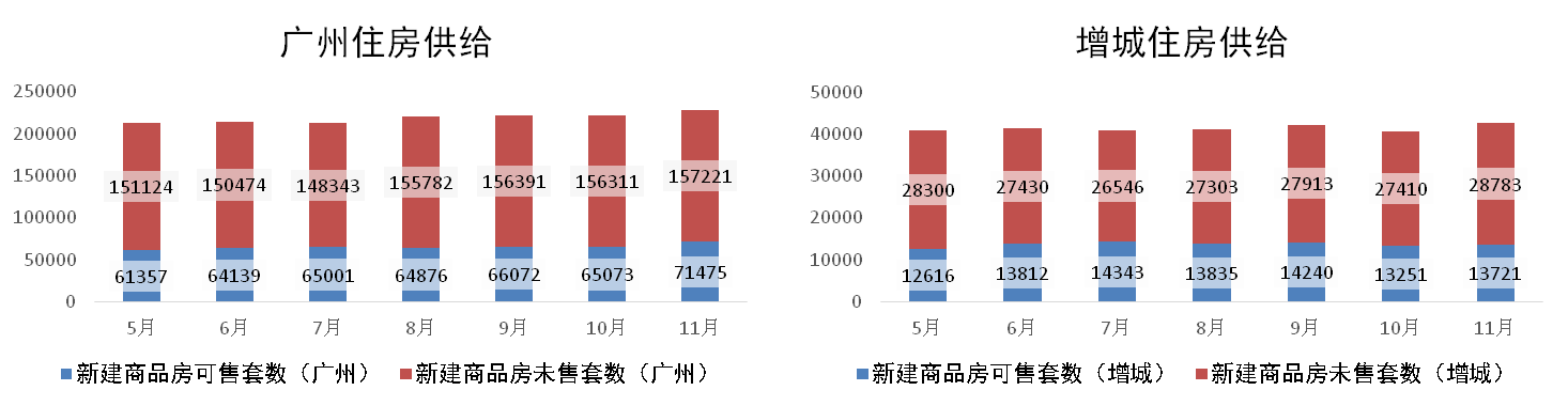分析認為:由于本月全市住宅成交整體下降,加上供應(yīng)保持水平量,致使市內(nèi)庫存量上漲。同理,增城在11月以等待政策優(yōu)化為主基調(diào),各樓盤推貨明顯放緩,區(qū)內(nèi)庫存較上月有所增加。