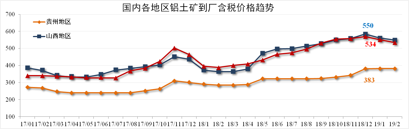 2月份,各地鋁土礦價(jià)格有不同程度的下滑,貴州(AL:60%,A/S:5.5-6)到廠含稅價(jià)月均價(jià)383元/噸,與1月價(jià)格持平;山西鋁土礦550元/噸,環(huán)比下降2.03%;河南鋁土礦534元/噸,環(huán)比下降3.09%。