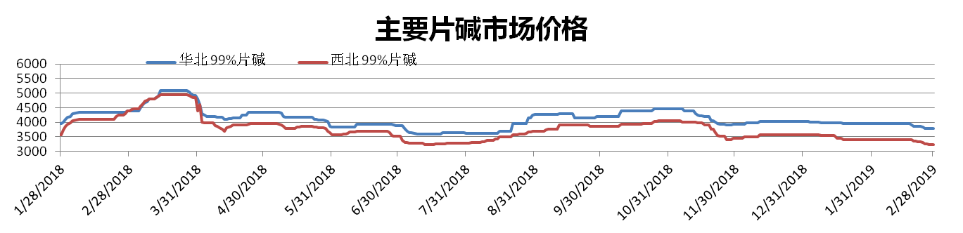 2月份國內(nèi)片堿的總體成交有所下降,市場整體走勢(shì)繼續(xù)下行。截止到2月28日,西北99%片堿市場價(jià)為3225元/噸,環(huán)比下降3.42%;華北99%片堿市場價(jià)為3775元/噸,環(huán)比下降1.79%。