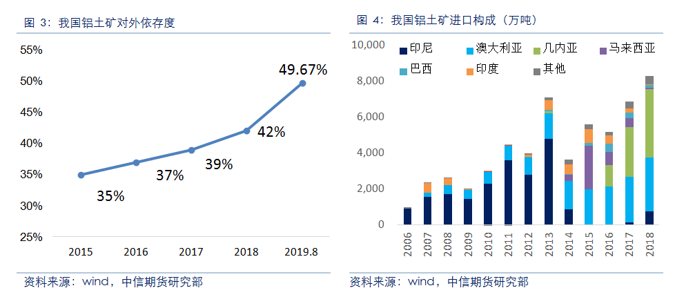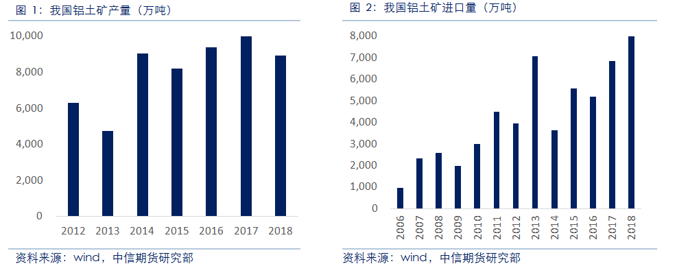 海關數據顯示,2014年以來,我國鋁土礦進口保持穩步增長。2018年,我國氧化鋁產量約為7200萬噸,鋁土礦產量約1億噸,2018年全國進口鋁土礦約占國內礦石總供應量的42%。海外礦石因儲量豐富、開采成本低、礦石品位較高等優勢逐漸受到國內氧化鋁企業的青睞,另外,隨著山西地區資源過度開采,鋁土礦品位下降,山西政府有保護省內資源的意愿,預計該地區礦石開采將繼續受到限制,進口礦使用將逐漸成為主流。
