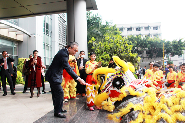 良辰吉時,葉董事長帶領干部員工共同祈福,隨后,葉鵬智董事長、吳秋顏董事、吳作榮理事長、夏文鋒監事長、黃丹華董事、葉鵬勇董事分別為六頭祥獅點睛。