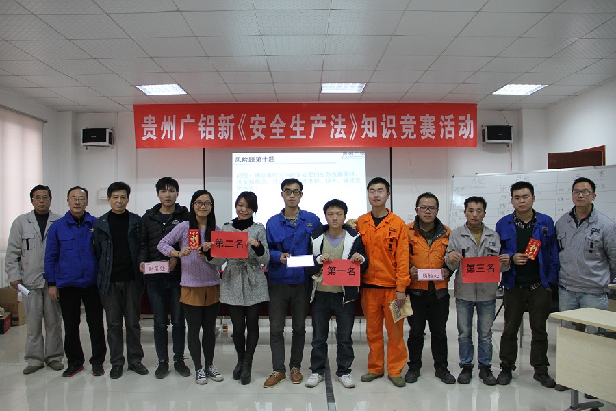 發稿時間:2014-12-25為深入宣傳貫徹國家頒布的新《安全生產法》,增強廣大員工紅線意識,促進企業安全生產,2014年12月24日下午14:00時,貴州鋁業公司黨支部、工會、安環處共同組織開展了新《安全生產法》知識競賽活動。此次活動在貴州鋁業公司綜合辦公樓五樓黨員活動室舉行,公司總經理、工會主席、安環處處長、財務處長等領導到場觀看了比賽。